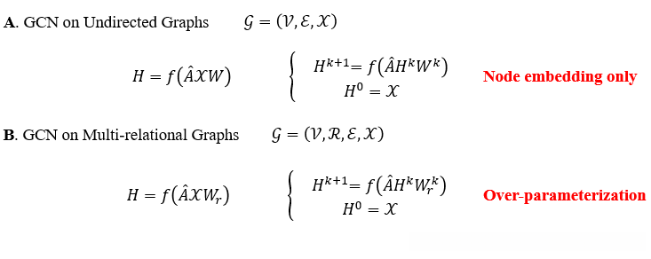 - 类似于知识图谱这样的多关系图(或网络)才是现实世界中最普遍的图数据类型,而多数GCN的编码函数对于处理这样的多关系图是不适合的。而为了使用GCN去建模多关系图,需要对GCN的编码函数做适当的调整,即𝐻=𝑓(𝐴𝒳𝑊𝑟) 。显而易见的是,这样的改进虽然可以对多关系图进行建模,但是随之而来的问题也是致命的。当多关系图中的关系类型过多的时候,这样的编码函数会引进多个关系矩阵𝑊𝑟,这样的参数过载对于模型的训练是极其不利的,甚至导致模型不可训练。