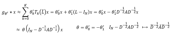 ,𝜆𝑚𝑎𝑥代表拉普拉斯方程特征值中的最大值。基于切比雪夫多项式进行近似表达时,并将K限定为1且𝜆𝑚𝑎𝑥设定为2时,则图信号经此变换后的公式则可简化为