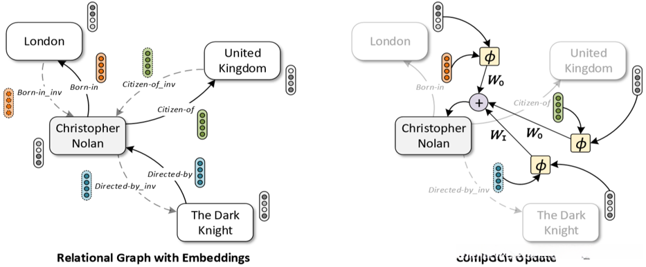 如图3所示,CompGCN框架相较于其他复杂架构而言相对较为简单,并主要采用两阶段学习策略。该方法基于给定的多关系图节点与边表示(其中可以通过其他方法获取初始表示),并设计了一种更新机制以优化网络性能。研究者将边的方向分为出边、入边以及自环边,并分别对应着三种学习矩阵来更新中心节点(Christopher Nolan)的相关向量表示。