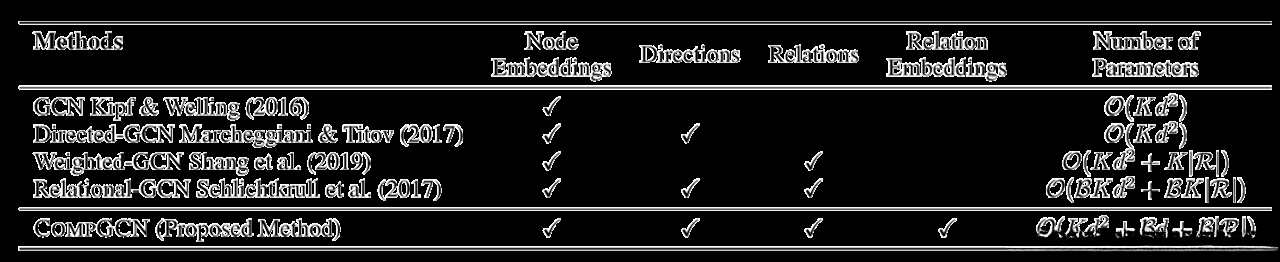图4展示了CompGCN与其他方法在细节上的对比结果。结果显示CompGCN仅使用了不同类型的向量组合方式以及学习矩阵。