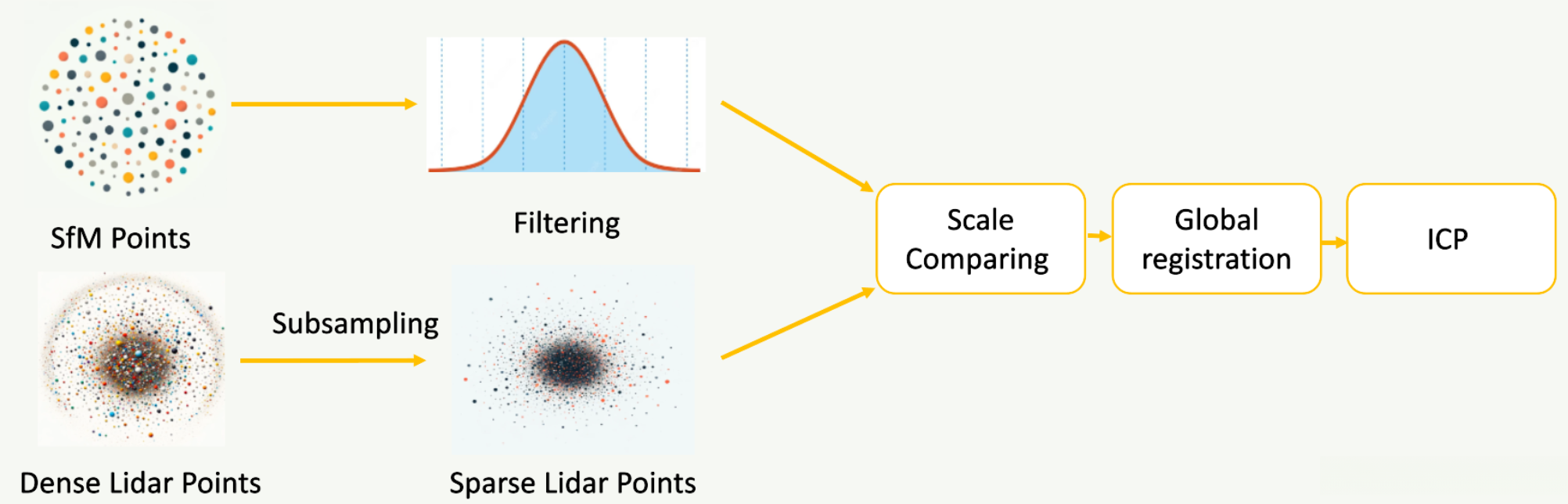 To do this, we find the maximum distance or variance in the SfM, as there are always some points far from the center in SfM. Then, we perform coarse matching manually and fine-tune it using ICP(Iterative Closest Point).