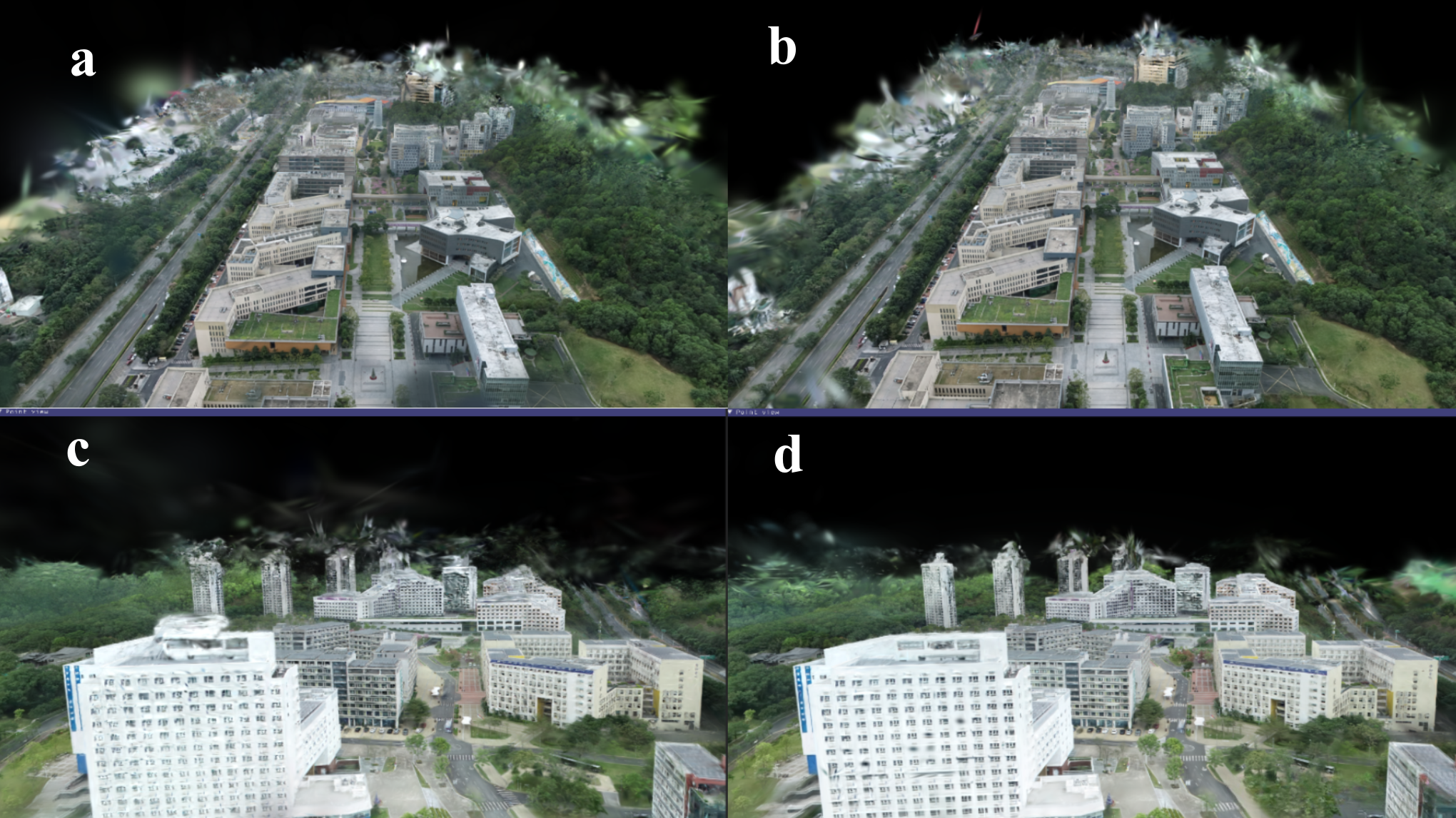 (b,d) shows the result of using lidar-fused Gaussian Splatting.