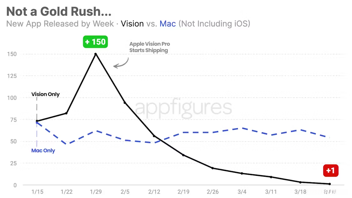 4、新应用发布趋势:在苹果一月份开始接受提交应用时,开发者在第一周就发布了73个新应用和游戏。随着开发者争相在第一天发布和苹果审查团队优先审查AVP应用,新应用的数量在第三周几乎翻倍,达到了150个。然而,随着Vision Pro设备的实际发售,新应用的发布速度开始指数级放缓,到三月份最后一周仅有一个新应用发布。