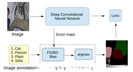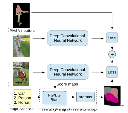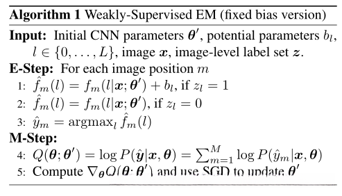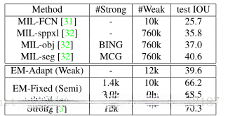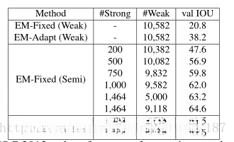 **** 强标注就是像素级标注,弱标注是图像级标注,文章结合两者,在DCNN的SGD训练过程中,同时喂入这两种数据,采用EM算法在每次迭代中估计弱注释图像的潜在语义分割。