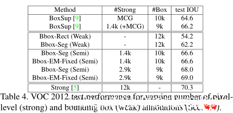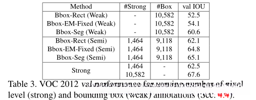 对比图像级和边界框级标注,可以看到当足够数量的像素级注释也可用时,边界框标注相对于图像级标注几乎没有什么价值。