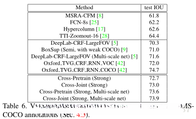 Cross-Pretrain(strong):在MS-COCO上预训练,替换顶层网络的权重,在VOC上fune-tuning,两者都是像素级标注。