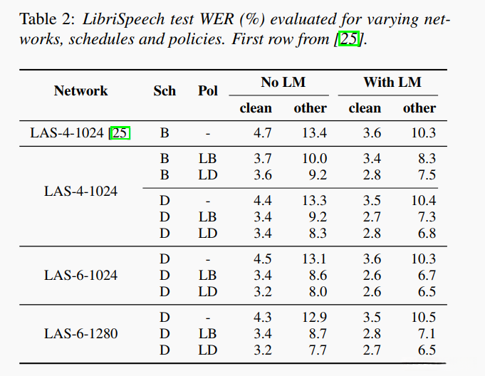 基于LibriSpeech 960h平台对LAS-4-1024、LAS-6-1024以及LAS-6-1280网络进行了训练,并采用了包括None、LB与LD三种增强方案以及B/D两种不同训练计划在内的综合优化措施。该实验未采用标签平滑化方法进行处理。在实验设置中,默认学习率被设定为5\times 1e^{-3}并使用了512的批量大小,在32块Google Cloud TPU上运行了7天时间。除了上述两种超参数设置外,其余所有超参数均保持一致,并未进行额外调整以优化性能表现。表2展示了基于dev-other集验证的数据测试结果。通过对比分析发现,在该任务中应用增强方案能够显著提升网络的训练性能,在更为严格的增强方案下以及较长的学习率计划下效果更加理想。
