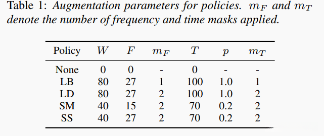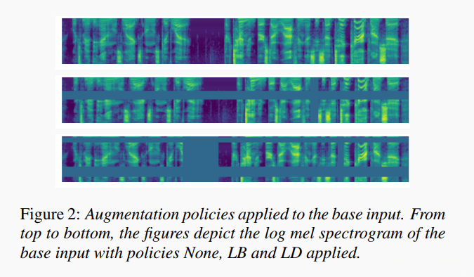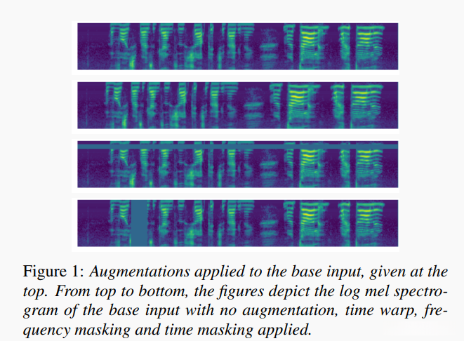 图1展示了应用于单个输入的各种增强示例。经过对log mel频谱图的标准化处理后, 将遮蔽值设为零等价于将其设为其均值。我们可以通过采用多个频率和时间遮罩的策略来实现减少覆盖区域出现重叠的情况。