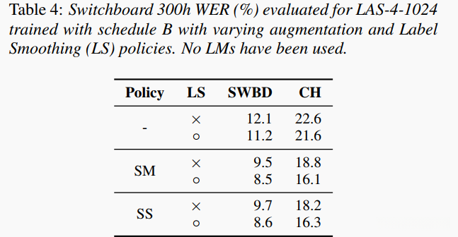 我们使用策略(None、SM、SS)和计划B来训练LAS-4-1024。与之前一样,我们将峰值学习率设置为0.001,总批量大小设置为512,并使用32个Google Cloud TPU芯片进行训练。这里的实验有和没有标签平滑两种情况。由于没有一个规范的开发集,我们选择在训练计划的最后一个检查点进行评估,我们选择将计划B的步骤设为100k。我们注意到,在衰减计划完成后(步骤sf),训练曲线会放松,网络的性能变化不大。表4展示了Switchboard 300h的各种增强策略在有无标签平滑的情况下的性能。我们可以看到,标签平滑和增强对于这个语料库具有累加效果。