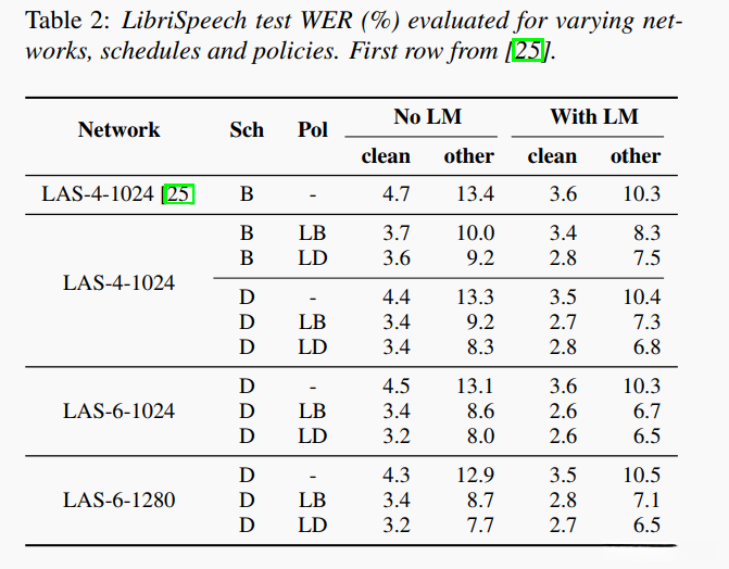 我们采用了最大的网络LAS-6-1280,并按照计划L(预计约需24天)以及策略LD来进行训练以最大化其性能;当处理到时间步<140k时打开了标签平滑技术;通过评估最佳dev-other性能对应的检查点来报告测试集上的表现;即使没有语言模型 LAS-6-1280 依然表现出色;我们可以通过浅层融合的方式引入语言模型可能会进一步提升系统能力;结果见表3