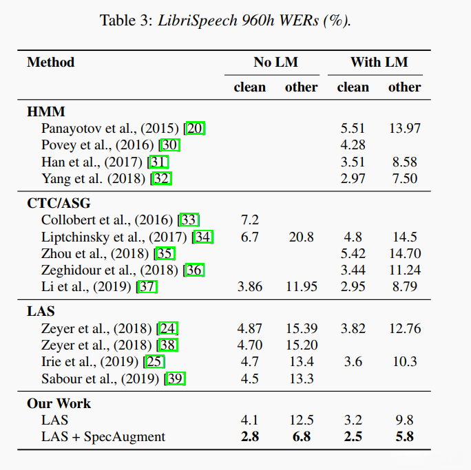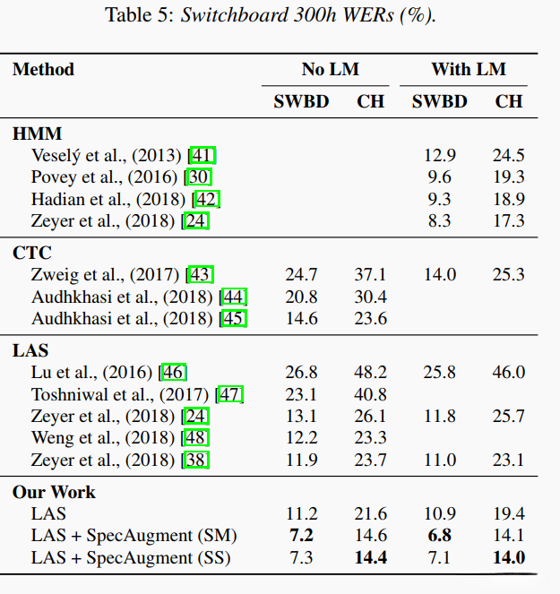 在本节中详细描述我们在LibriSpeech和Switchboard上使用SpecAugment进行的实验研究。我们展示了最新的研究成果并证明其超越经过精心优化的设计方案的结果