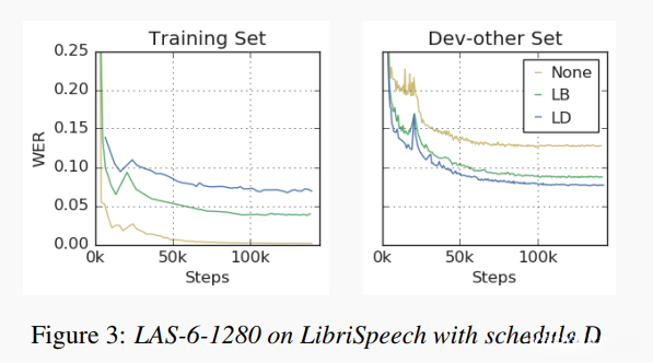 标签平滑将带来训练过程中的不稳定现象。 我们发现,在LibriSpeech的数据集上施加强化处理时(即进行强化训练),采用标签平滑技术会导致不稳定性的比率显著上升。进一步地,在学习速率发生衰减的情况下这一现象会更加明显因此我们决定在 LibriSpeech 数据集上的强化学习任务中实施一个基于标签平滑的策略:即仅在学习速率计划的第一阶段进行标签平滑处理以缓解潜在的问题。