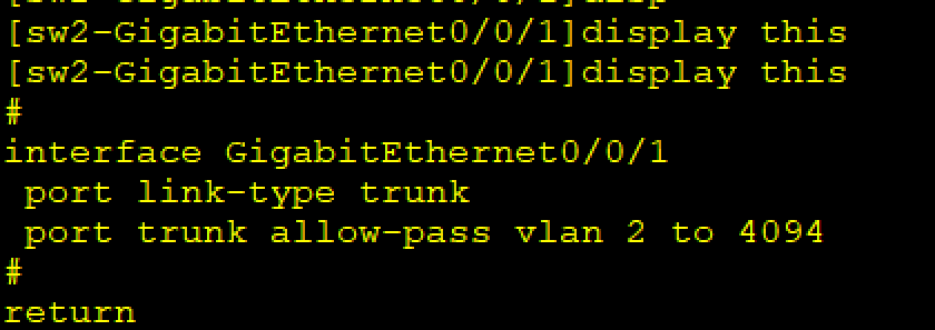 [sw2-GigabitEthernet0/0/1]port trunk allow-pass vlan all