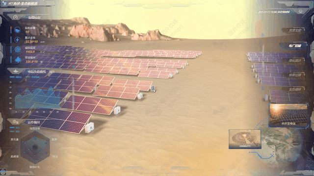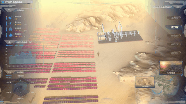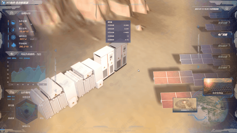 HT 支持 2D 轻量化模型搭建的光伏储能监测场景。结合光伏发电原理与储能模型,对太阳电池板(组件)、控制器和逆变器三大部分以逻辑图形式呈现,帮助管理人员理清光伏发电运作脉络。从而对输出能量平衡调节,全面分析,保障光伏供电可靠性,提升阴雨天停电事故的应急效率。