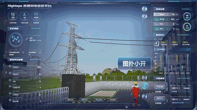 通过点击交互场景中的发电塔模型,以二维弹窗形式弹出发电塔相关信息,与后台数据进行联动,接入真实数据,展示发电塔发电情况与发动机运行状态,做到实时监测管理。