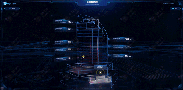 场景以科幻线框风格展示,突出储能设备模型。监测各楼层运行的储能设备以及实时功率,结合后台数据的实时更新,形成知识库,需要时释放储存能量。