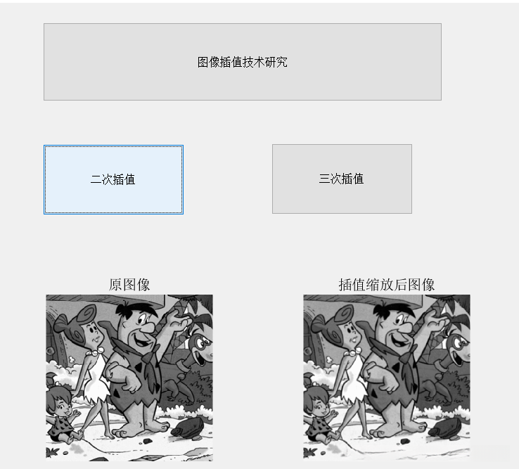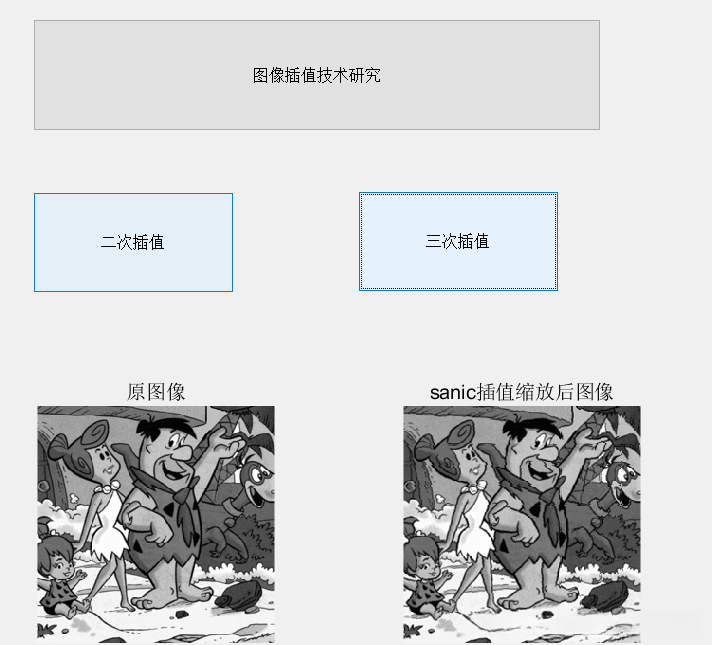 axes(handles.axes1)并调用imshow函数以显示图片A,并将其标题设置为'原图像';axes(handles.axes2)并调用imshow函数以显示经过sanic插值缩放后的图片B,并将其标题设置为'sanic插值缩放后图像'。