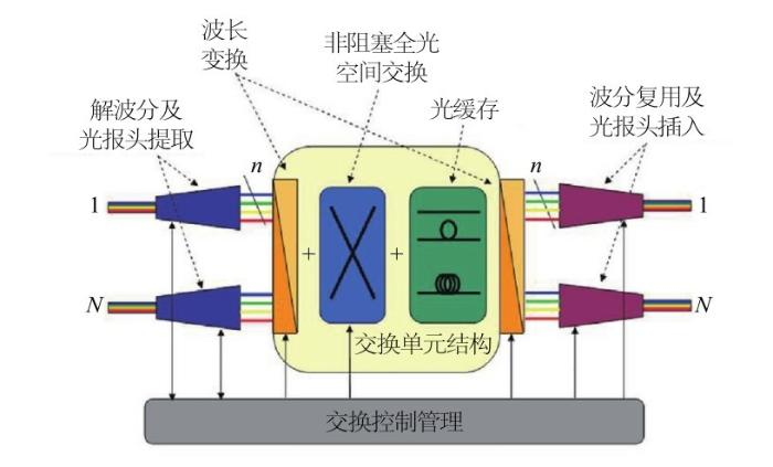 如图3所示,OPS技术属于光包交换领域,并采用更细粒度的光分组作为交换单元[34]。虽然遵循电域存储转发原则[34]这一规定性做法,在光域中实现了类似的技术架构——即所谓的"电分组交换在光域中的实现"模式[34]。该技术体系具有容量大[35-36]、交换灵活[35-36]等特点,并支持速率与格式透明传输;其粒度细且高度可配置;资源利用率也较高[35-36]。将OPS技术与波分复用(WDM)结合应用后,在理论上实现了网络交换容量与传输容量的有效匹配[35-36]这一目标已逐步成为下一代光网络实时处理的重要支撑技术[35-36]