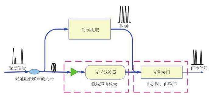 该种技术可在光域直接提升光信号的质量水平。它通过使输入与输出信号的幅度或相位发生突变式的非线性转换来实现对信号噪声的有效抑制。全光再生系统则主要包括再放大、再整形及再定时功能模块[41-42]。在全光通信领域内应用的3R再生技术目前处于快速发展阶段(如图5所示)。由于光学器件性能持续优化,在光纤通信系统中已经发挥着越来越重要的作用。具体而言,全光3R再生系统可划分为三个功能单元:全光放大模块、时钟提取模块以及判决处理模块[43-44]。