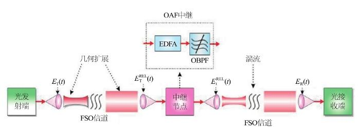 在光网络系统中,由于传输链路的多跳特性导致光信号传输质量受到影响,在这种情况下不仅会引发功率衰减还会降低信噪比水平。因此相应的,在交换节点处也需要对光信号进行相应的放大中继处理以维持信号质量。具体而言如图4所示[38]:光纤输出端面后经过一段空间距离传播到达交换节点处之后所接收到的混合信号不仅包含了原始发射端的信息内容还包含了来自传播过程中引入的各种噪声影响因素包括但不限于背景辐射ASE噪声以及拍频域内的各种干扰分量等。随后在交换节点内部则会采用掺铒光纤放大器(EDFA)来完成对光信号幅度的有效提升并通过带通滤波器来实现对于带外干扰成分的有效抑制最终将增强后的电信号重新发送至后续路径继续传递下去的过程中接收端部分则通过光电探测器将检测到的光信号转换为电信号并经由后续电路完成数据恢复工作这一完整的"单跳"放大增益系统能够有效保证接收侧输出数据的质量并且其输出的数据完整性不仅包含原始信息内容还会伴随有来自多种干扰源的影响而形成一系列复杂的噪声成分其中一部分主要来自于背景辐射另一部分则来源于自放大器产生的ASE噪声以及其他拍频域内的各种高频干扰分量[39-40]