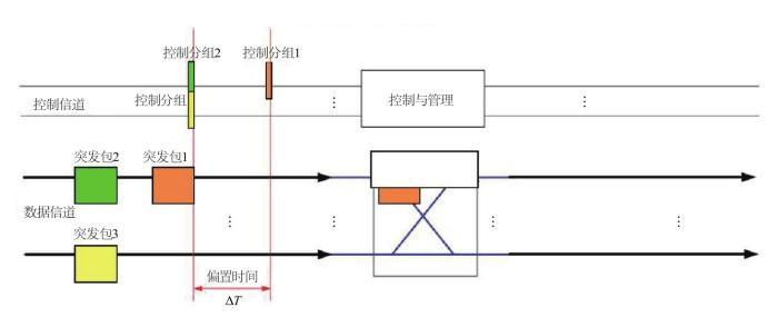 基于OBS技术将数据组织成burst packets(图2所示),每个burst packet由control packet与data packet构成。data packet具备相同的属性(如IP分组字段、以太网帧字段与中继帧字段等)。每个data packet都对应一个control packet(参见文献[31]),其中包含了与传输相关的关键信息包括突发数据长度、偏移时间、生存时间、波长以及路由参数等信息。基于OBS的技术架构设计存在核心挑战——在实现资源保留功能时需要权衡效率与灵活度之间的关系。典型采用的双向资源保留方案是call signaling protocol(参见文献[32]),然而这种组织方式会导致较大的延迟问题(参见文献[33])。基于OBS的技术架构设计存在核心挑战——在实现资源保留功能时需要权衡效率与灵活度之间的关系. 采用burst packet的方式能够满足高吞吐量的数据传输需求及低延迟的小命令传输需求;然而这种组织方式会导致较大的延迟问题.