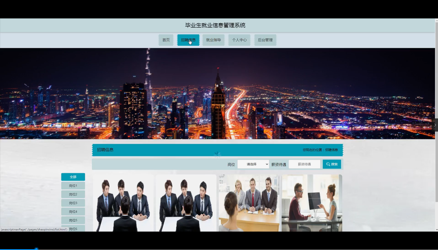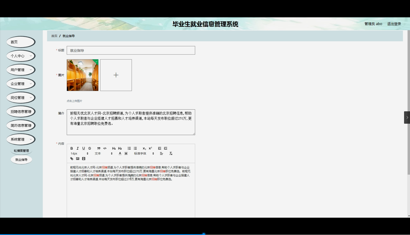 在现实生活中,每年毕业的大学生数量庞大,在职校教育领域已达到五六百万人左右,并呈现出多样化趋势。本选题的研究成果将致力于打造一个高效的学生就业信息管理系统,在线平台可为企业提供发布岗位及招聘信息的服务,并为高校学生提供投递简历等功能支持。该系统旨在提升高校毕业生求职成功率的同时,也为职业规划者提供精准的职业指导,并进一步缓解高校求职者与企业之间信息不对称问题