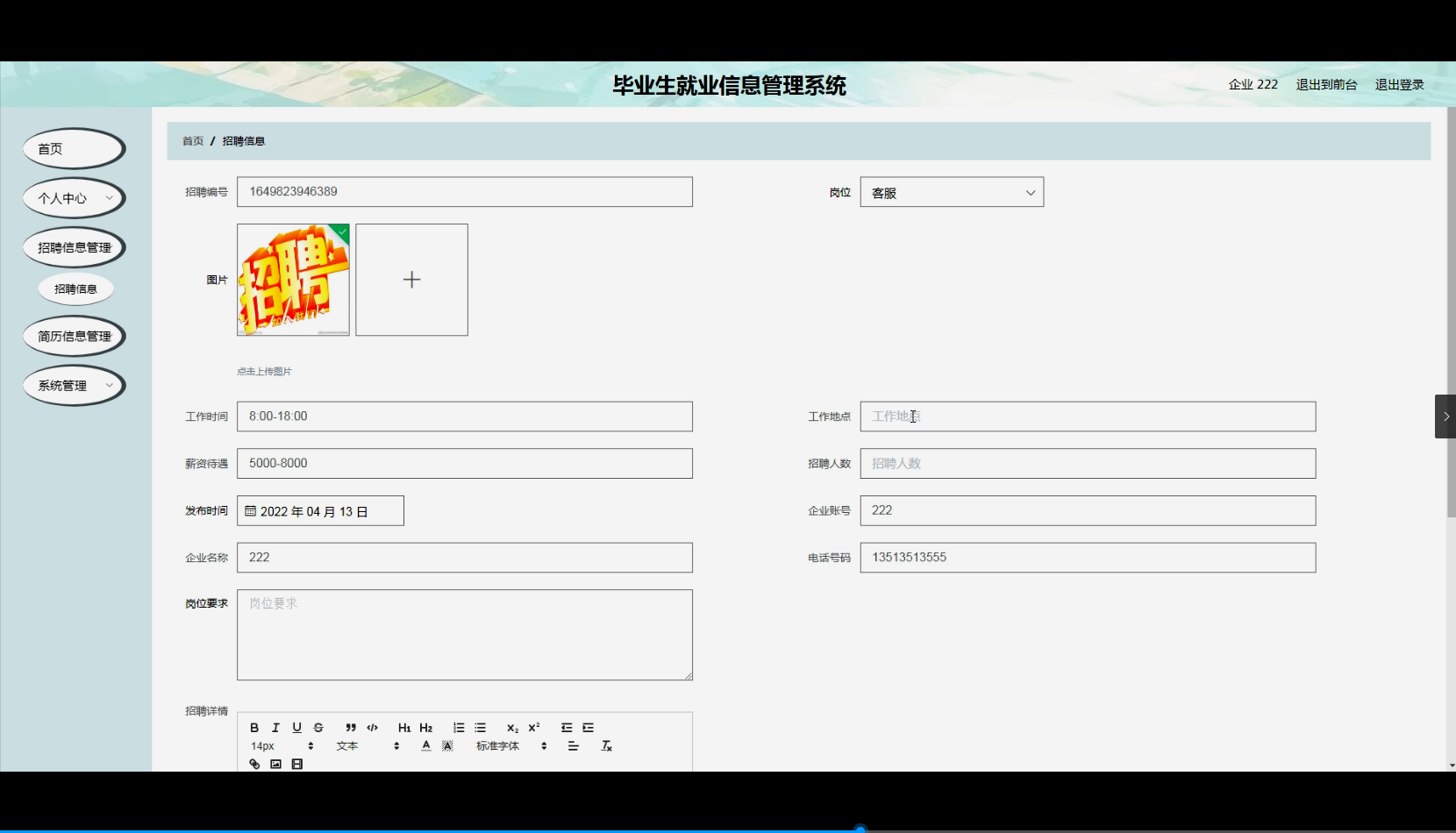该系统主要涵盖了多个功能领域。其中以毕业生为主的研究方向包括用户注册登录功能以及个人信息管理模块。该模块不仅能够完成各类用户的注册与登录操作,并且能够对注册信息进行实时更新与维护。其中针对毕业生这一主要求职群体的信息管理系统需要特别注重数据准确性与完整性的保障工作;而针对企业这一信息发布主体则需要建立完善的基础资料管理制度以及招聘需求发布规范。在企业相关功能方面则需要实现信息发布主体的基本职责定位并提供相应的信息发布支持;同时还需要建立完善的岗位分类排序机制以便于求职者快速定位所需职位信息。在招聘信息管理方面则需要构建完整的信息发布流程体系涵盖招聘信息审核发布推送等多个环节;并通过严格的审核标准确保招聘信息的真实性和时效性。最后在简历信息管理方面则需要实现个人简历上传更新以及企业招聘需求匹配等功能以提高招聘效率和匹配精准度