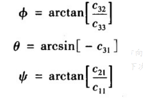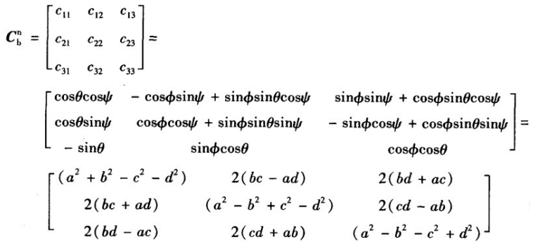 通过比较上述等式的各个元素,四元数可以直接用欧拉角或余弦表示,同样欧拉角也可用方向余弦或四元数表示。