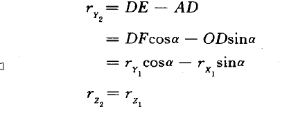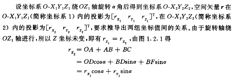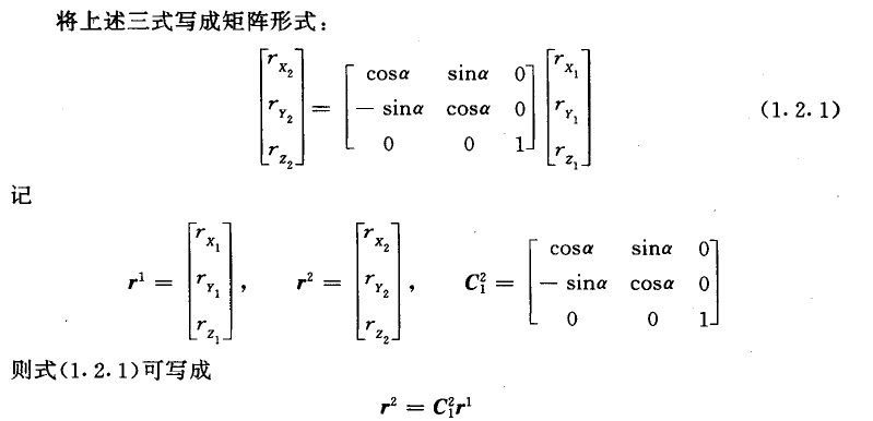 该式描述了同一矢量在不同坐标系内投影间的变换关系,C称为从坐标系1至坐标系2的变换短阵。上述变换关系分析中,坐标系2是经坐标系1仅绕Z1轴旋转α角后获得的,为便于叙述,称仅绕一根轴的旋转为基本旋转。两坐标系间任何复杂的角位置关系都可以看作有限次基本旋转的复合,变换矩阵等于基本旋转确定的变换短阵的连乘,连乘顺序依基本旋转的先后次序由右向左 排列。例如运载体的空间姿态可看作依次绕偏航轴、俯仰轴、翻滚轴作基本旋转后的复合结果。