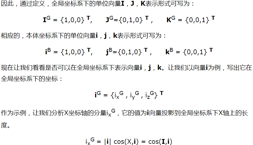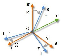 我们将本体坐标系定义为O-xyz,另外一个全局坐标系定义为O-XYZ,两坐标系的具有相同的原点O,如图所示。本体坐标系的x、y、z轴对应的单位向量分别为i,j,k ;全局坐标系X、Y、Z轴对应的单位向量分别为I,J,K。