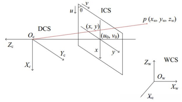 ICS代表图像坐标的二维平面(ICS)。从空间中一点p经相机制造物后,在图像平面上对应的二维位置(x, y)可以通过相机内参数矩阵进行数学转换。