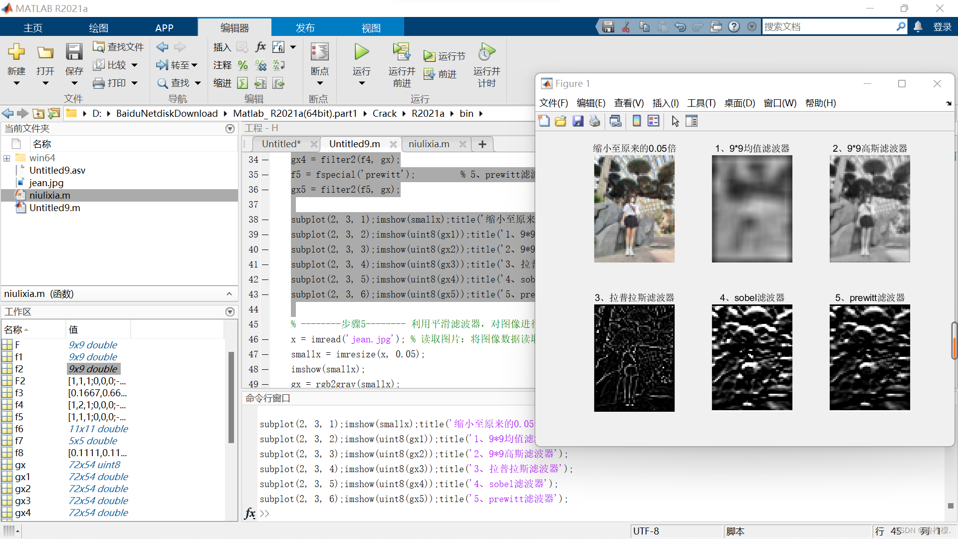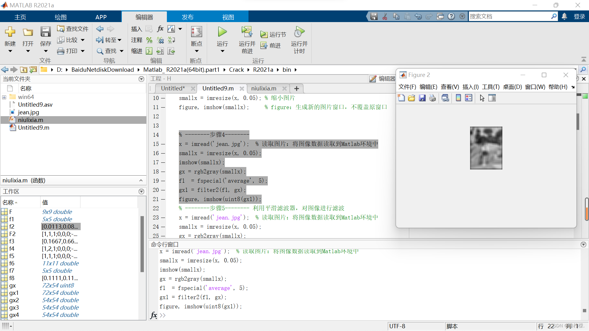 f1 = fspecial('average', [9 9]); % 1、9*9均值滤波器