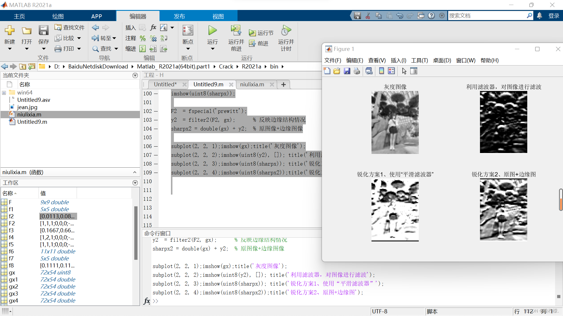 步骤10:通过使用uint8()或mat2gray()函数完成类型转换过程,并在同一窗口中同时展示原始图像与经锐化的图像;