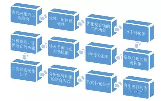 由于分子对接和药效团等虚拟筛选方法,受限于筛选速度,准确率不高,因此一般需要从筛选出的前50或100个小分子化合物中,作进一步地筛选。方法一般是先利用动力学模拟优化对接后的蛋白、配体复合物,验证蛋白与筛选出的小分子配体的结合情况;利用各种方法计算蛋白与配体的结合自由能,找出结合能最大的小分子,从而进一步筛选小分子化合物。