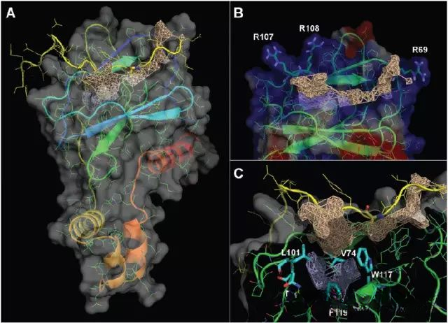 A为蛋白质口袋区域分析,网格处即为口袋;B为蛋白质表面静电势分析,口袋处位于高静电势区域;C表示蛋白质中一个氨基酸突变后生成了一个新的口袋,在浅黄色口袋下方出现了一个蓝紫色口袋,进一步分析表明这个口袋也是一个潜在的药物结合位点。