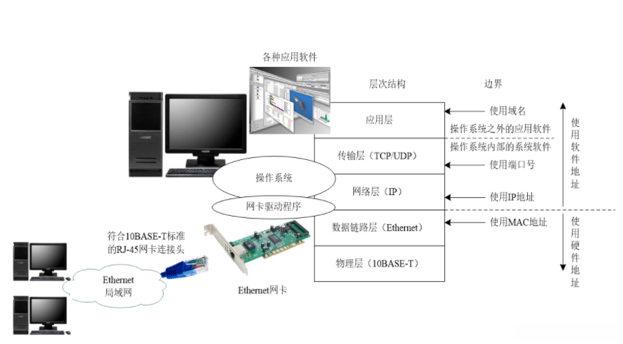 如果一台计算机想要连接到 Ethernet 网络,则这台 PC 的操作系统必须安装能够处理传输层 TCP/UDP 协议的应用程序,并且也需要配置能够处理网络层 IP 协议的应用程序来分配 IP 地址。此外,在该 PC 的扩展插槽中必须插入一块带有唯一 MAC 地址的 Ethernet 网络接口卡(如 10BASE-T 标准),并通过 RJ-45 双绞线将其连接到交换机以实现有效的 Ethernet 网络接入。最后,在操作系统中还需安装相应的 Ethernet 网络适配器驱动程序以确保正常运行。