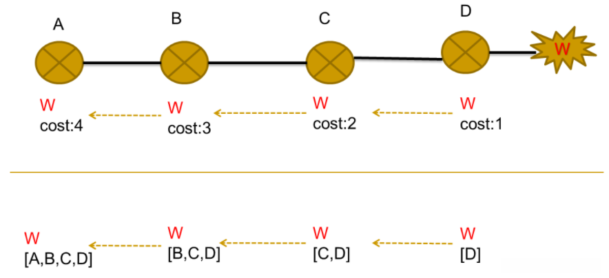 - 根据该路由选择算法,在任何一条较优路径出现时才会对路由表中的相应路径记录进行更新;反之,则会持续保留该记录直至问题解决为止。当某条关键路径失效时,在其对应的记录仍然存在于路由表中会导致系统因路径环路的存在而导致 Slow Convergence 现象发生。