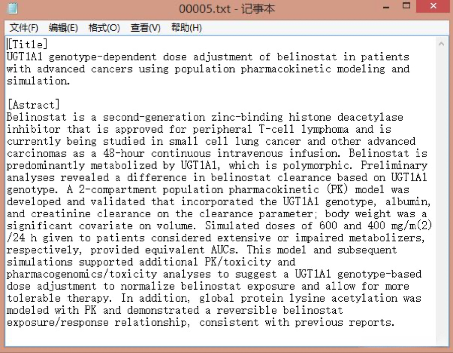运行后的结果如下显示:从编号为[编号范围]的多个文档中获取共400个txt文件。每个文档均包含标题信息与摘要内容,并且该数据集主要适用于生物医学领域中的本体构建、命名实体识别以及跨本体对齐等技术应用。