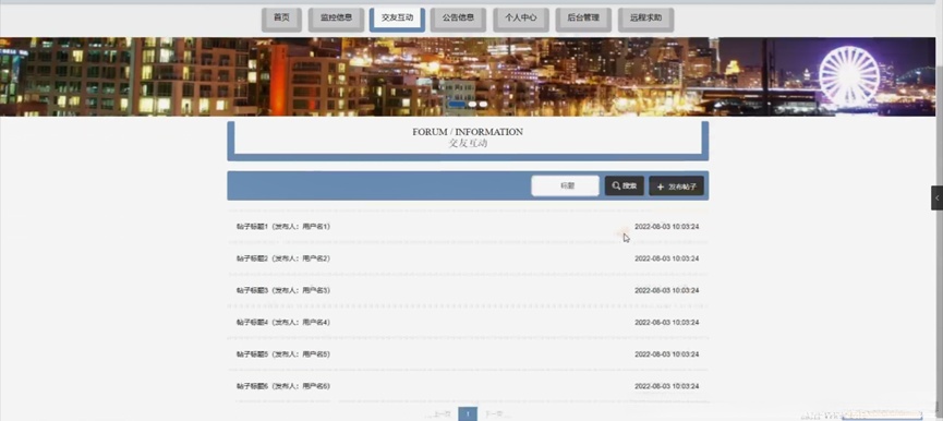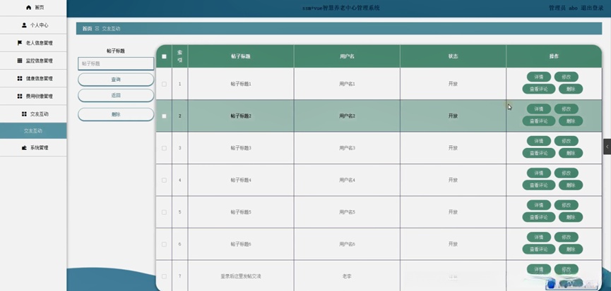 记录老人用户的交友互动信息,包括帖子标题、内容、发布时间等,管理员可以查看和管理互动内容。
