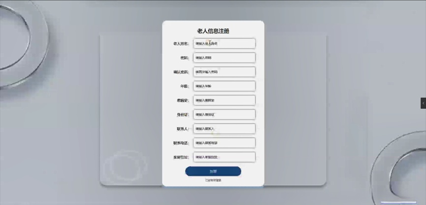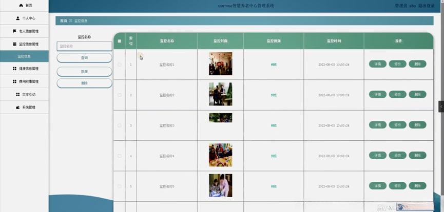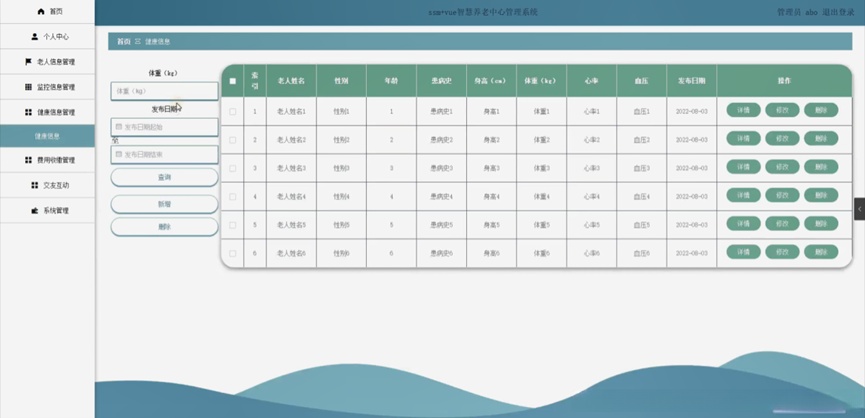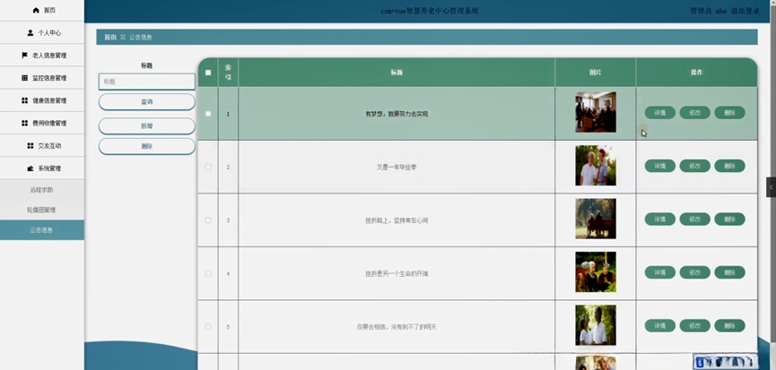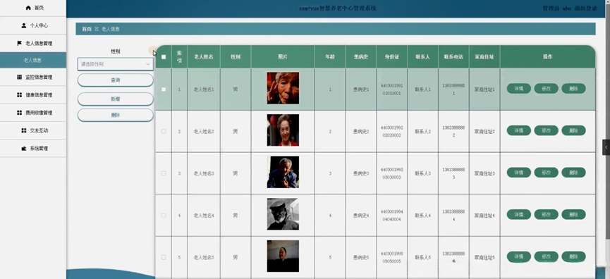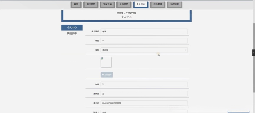 - 老人信息管理 :管理员可管理老人的健康信息、入住信息、监控记录等内容,便于对老人的综合管理。