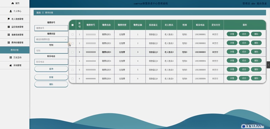 - 费用收缴管理 :记录费用收缴的详细信息,老人查看费用记录,管理员增删查改费用信息。