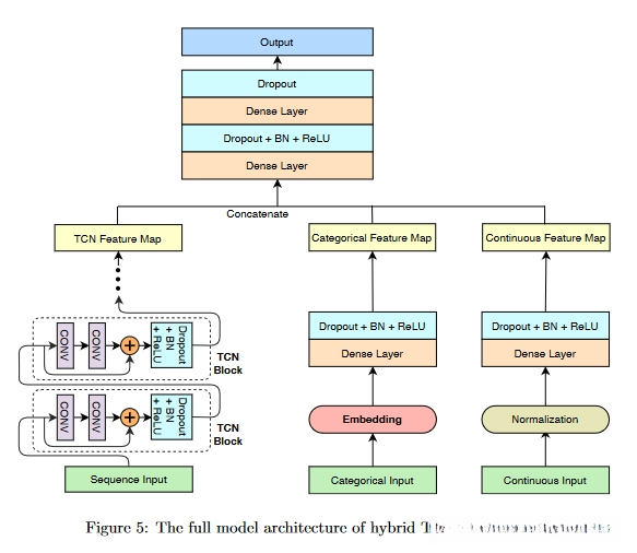 这里的TCN模块能够替代任何可学习时间序列模式架构的应用(包括LSTM、GRU等)。最后将一系列全连接层(称为"头层")应用于特征组合以生成最终预测结果。