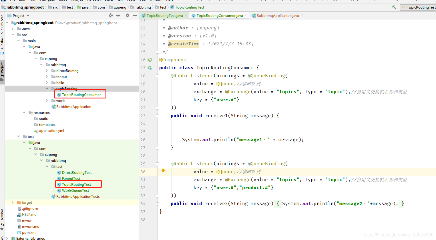 exchange = @Exchange(value = "topics", type = "topic"),//自定义交换机名称和类型