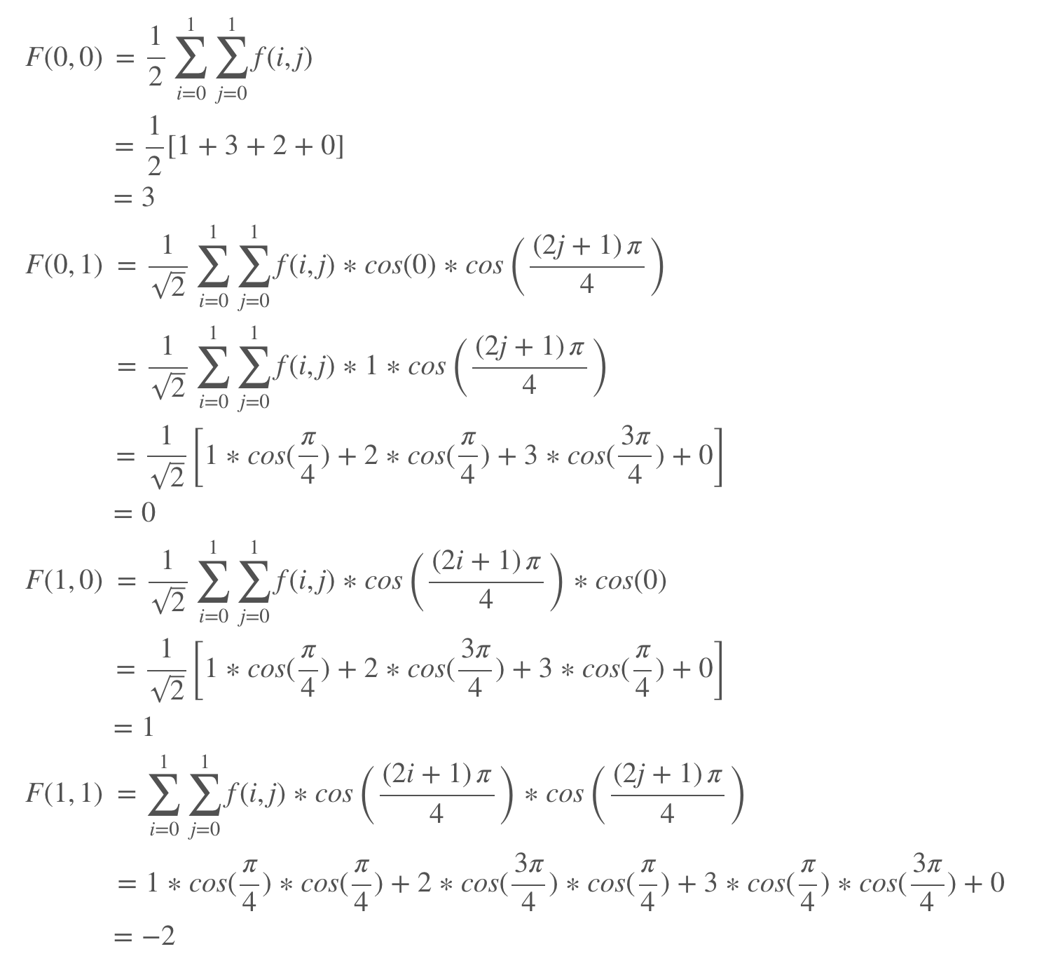 \u0026gt;\u0026gt;\u0026gt; import numpy as np\u0026gt;\u0026gt;\u0026gt; from scipy.fftpack import dct\u0026gt;\u0026gt;\u0026gt; d=np.matrix([[1,3],[2,0]])\u0026gt;\u0026gt;\u0026gt; dct(dct(d,axis=0,norm=\u0026quot;ortho\u0026quot;),axis=1,norm=\u0026quot;ortho\u0026quot;)array([[ 3., 0.], [ 1., -2.]])