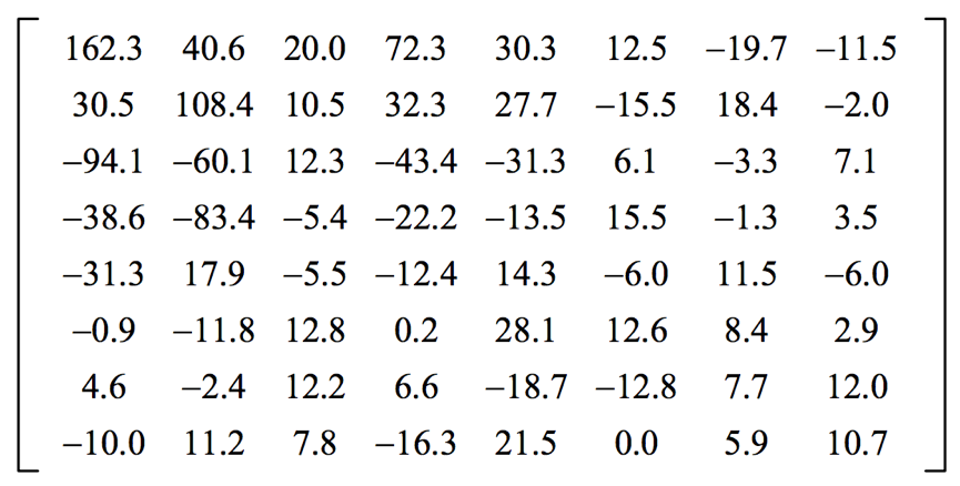 这是对一张8*8图片应用DCT变换得到的矩阵结果: