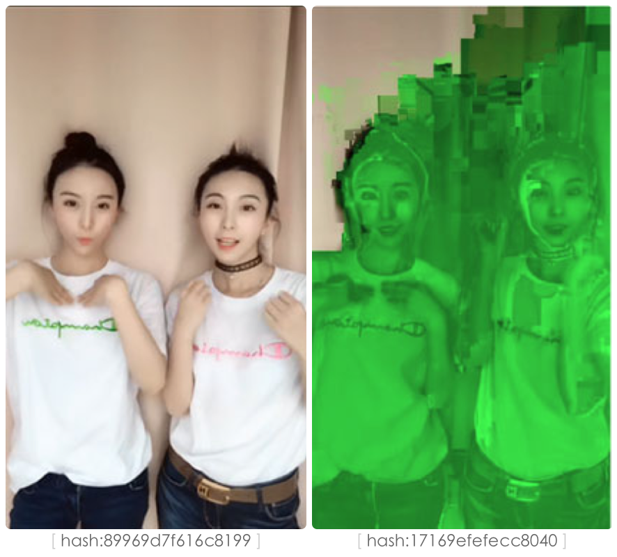 图片对比其实跟\u0026quot;以图搜图\u0026quot;本质上是同一种技术,通常有几种做法MSE,均值哈希,色彩直方图以及OpenCV里面一些提取图像特征的高级算法,如Sift,Surf等。基于移动端的运行效率,安装包大小,以及需求本身考虑,我们放弃引入OpenCV。MSE 属于逐像素对比,对像素值要求过于严格,太简单粗暴,色彩直方图不太好量化差异度。基于以上考虑,我们选择图像哈希算法,它可以输出汉明距离,方便量化软硬解结果的差异度。