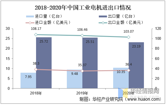 目前我国工业电机的出口量与进口量均高于前者;其中 exported products predominantly feature medium to small series, while imported products predominantly feature high-precision micro motors and large-scale power industrial motors. Products exported have relatively low technological content and are priced lower than their counterparts in other countries; whereas imported products are primarily high-precision micro motors and large-scale power industrial motors, with a unit price that is consistently higher than the export price of similar products. According to statistics, in 2020, China's import volume of industrial motors reached 10.35 billion台, with a total value of 36.4 billion USD; the export volume was 23.19 billion台, with a total value of 103.07 billion USD.