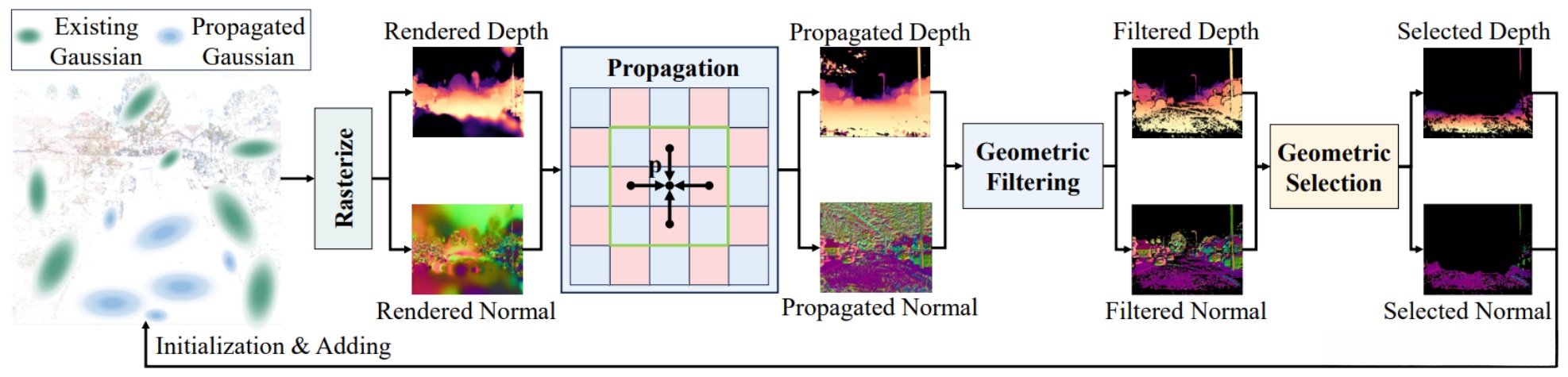 Overview of GaussianPro. The consistency of the normal directions among neighboring views is recognized as a critical factor in achieving accurate 3D surface reconstruction.