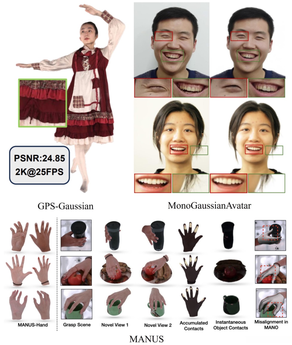 The achievements of GPS-Gaussian, MonoGaussianAvatar, and MANUS are notable. In turn, they investigate the 3DGS-based approaches in whole-body, upper-head, and lower-hand modeling respectively.