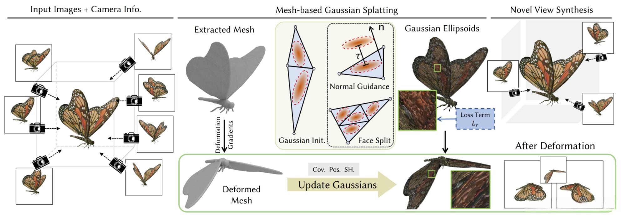 This pipeline, known as Mesh-based Gaussian Splatting for Real-time Large-scale Deformation, enables large-scale geometric editing through the binding of 3D Gaussians onto the mesh.